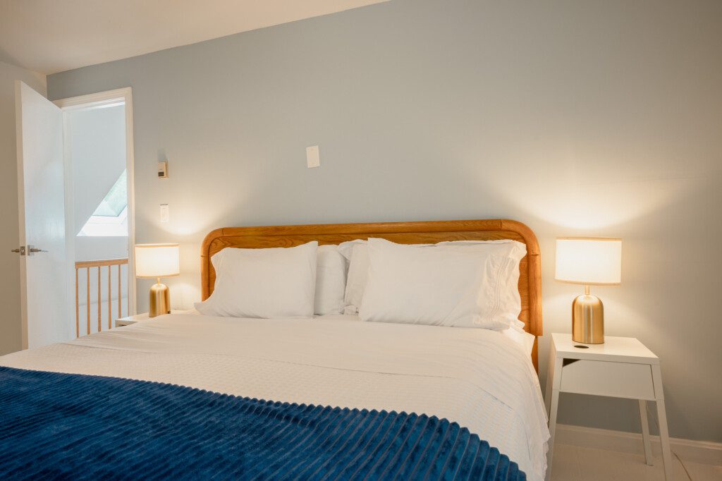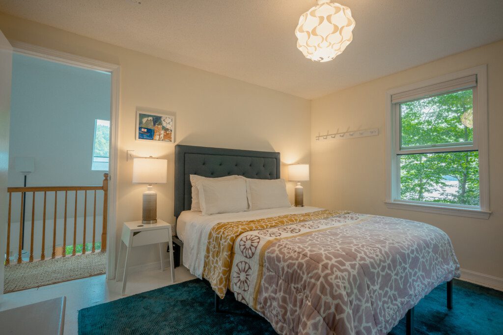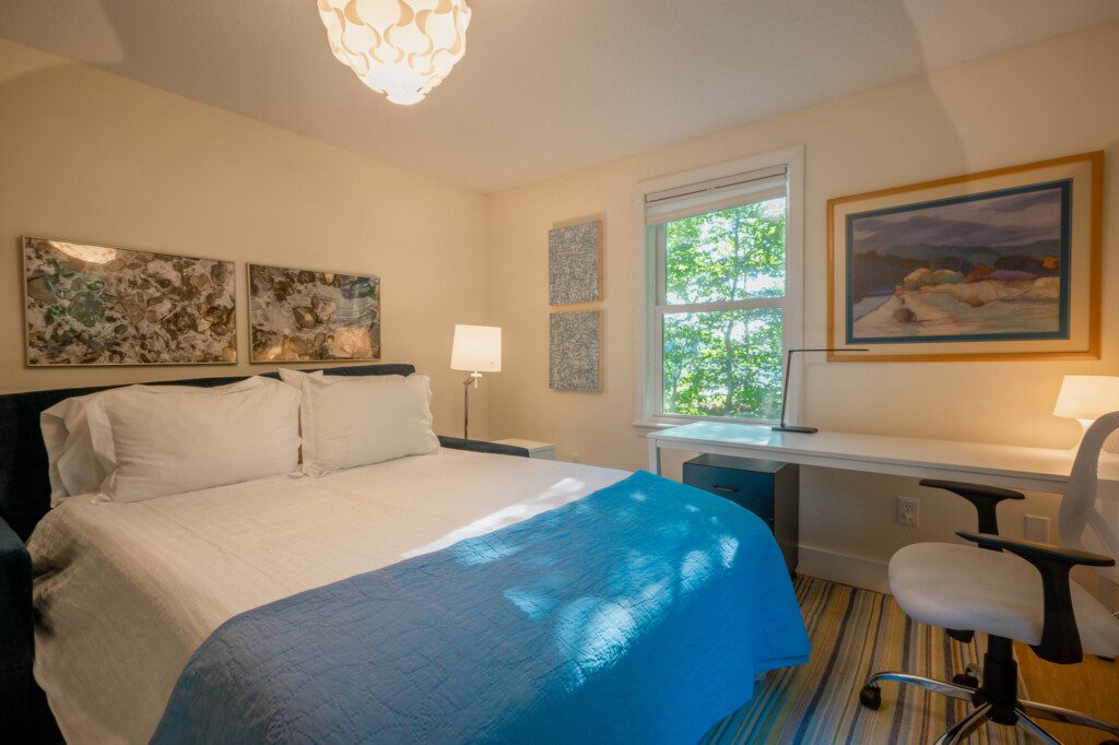 If you want to stay on the main level and next to a bathroom, there’s a cozy bedroom facing east and south. This has a West Elm sofa bed with a tempurpedic mattress topper that our guests rave about. It also has a desk with a view onto the lake and another view to the south courtyard garden.